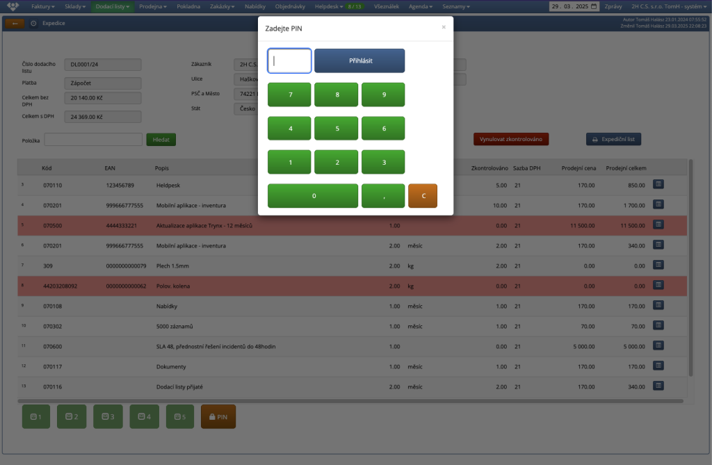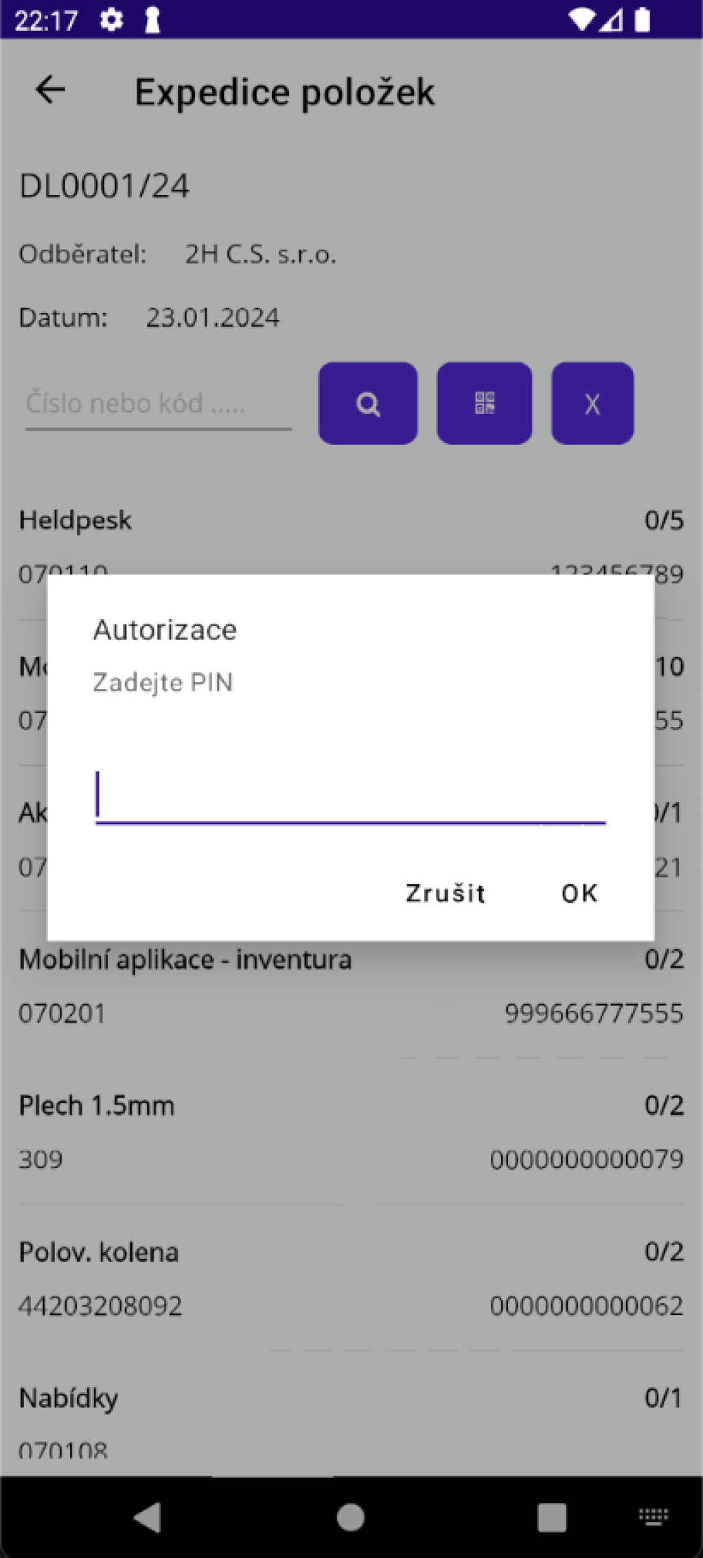 Ruční potvrzení může být podmíněno zadáním PINu, některého ze správců skladu. PIN je vyžadován jen pokud v hlavní aplikaci Trynx v "Nastavení -> Nastavení -> Přizpůsobení systému" zakliknete volbu "Vyžadovat potvrzení expedice pin kódem". PIN kód pak můžete správci skladu nastavit v kartě uživatele.
