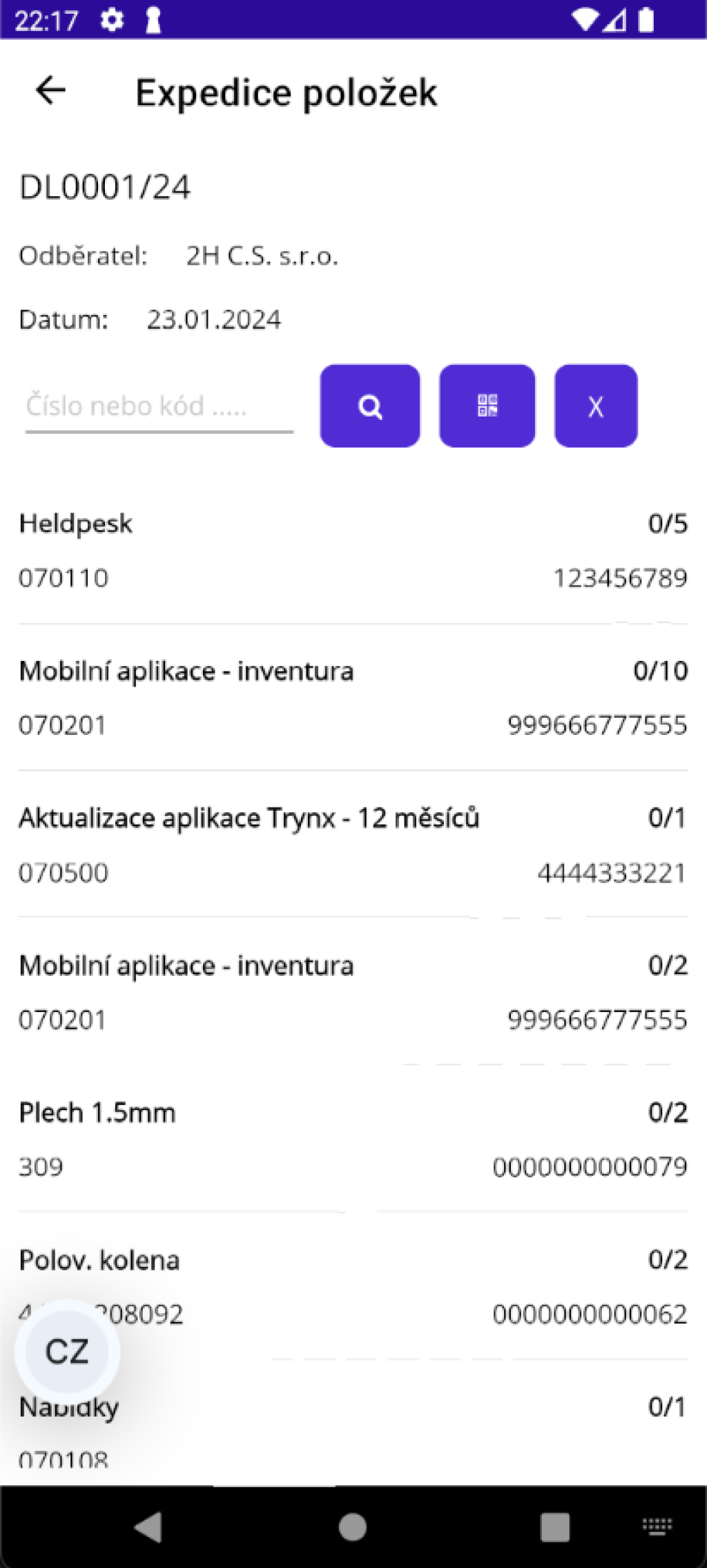 Zde můžete zadat ručně, nebo kamerou naskenovat, číslo dodacího nebo zakázkového listu. Po zadání čísla dokladu ťukněte na tlačítko s lupou. Program se pokusí najít doklad se zadaným číslem. Pokud jej najde, ukáže jeho obsah. Aby mohl být doklad nalezen, musí být k němu být vytvořen expediční doklad (tlačítkem "Do expedice" například z dodacího listu) a dokladu musí být ve stavu "Expedice" (to se stane automaticky po kliknutí na tlačítko "Do expedice").