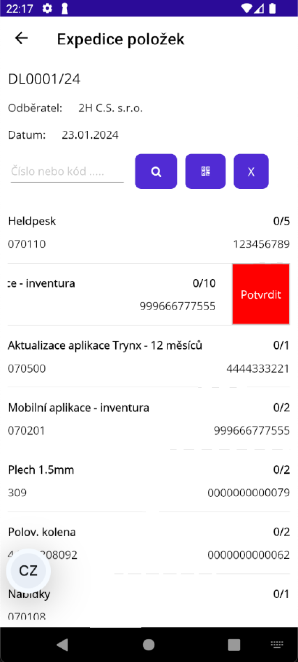 Může se stát, že položka nemá správný EAN kód, nebo jej z nějakého důvodu není možno naskenovat nebo zadat. V takovém případě můžete přejetím prstem zprava doleva na položce provést ruční potvrzení kontrolovaného množství.