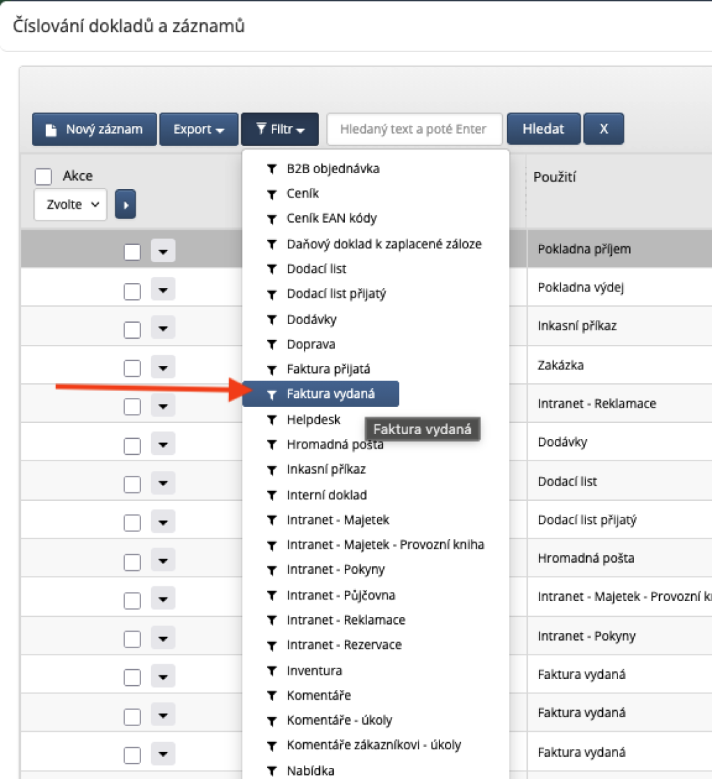 Otevře se okno se všemi číselnými řadami. Zde si můžete vyfiltrovat jen ty, které souvisí s dokladem, který řešíte např. "faktury vydané"